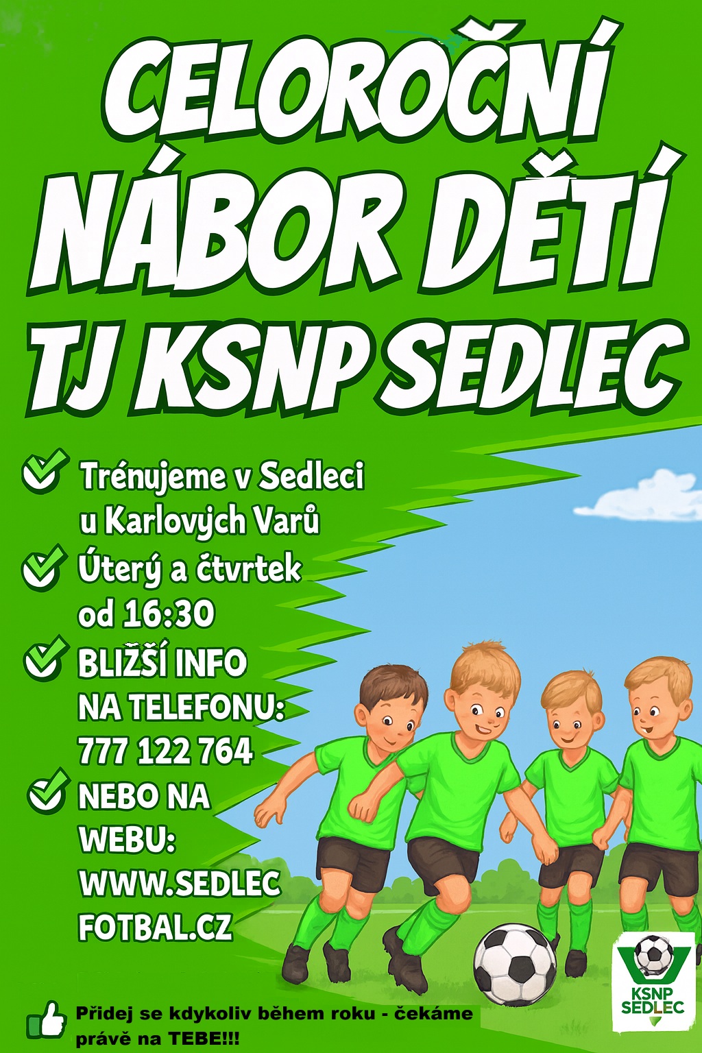 Jsme TJ KSNP Sedlec, fotbalový klub ze Sedlece – městské části Karlových Varů – který se specializuje na výchovu mládeže. U nás není fotbal jen sportem, ale životní vášní a cestou, která rozvíjí charakter, tělo i mysl.