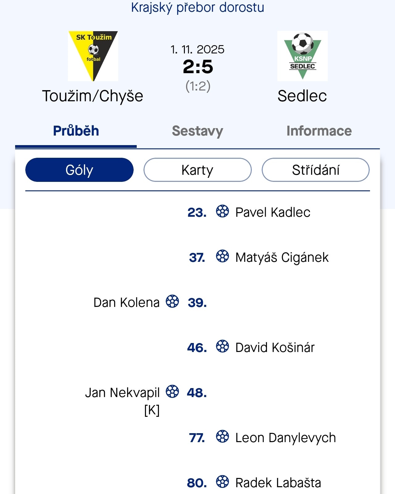 Kryštof Kornatovský ⚽⚽, Samuel Burkert ⚽, Pavel Kadlec ⚽, Radek Labašta ⚽, Josef Kapr ⚽